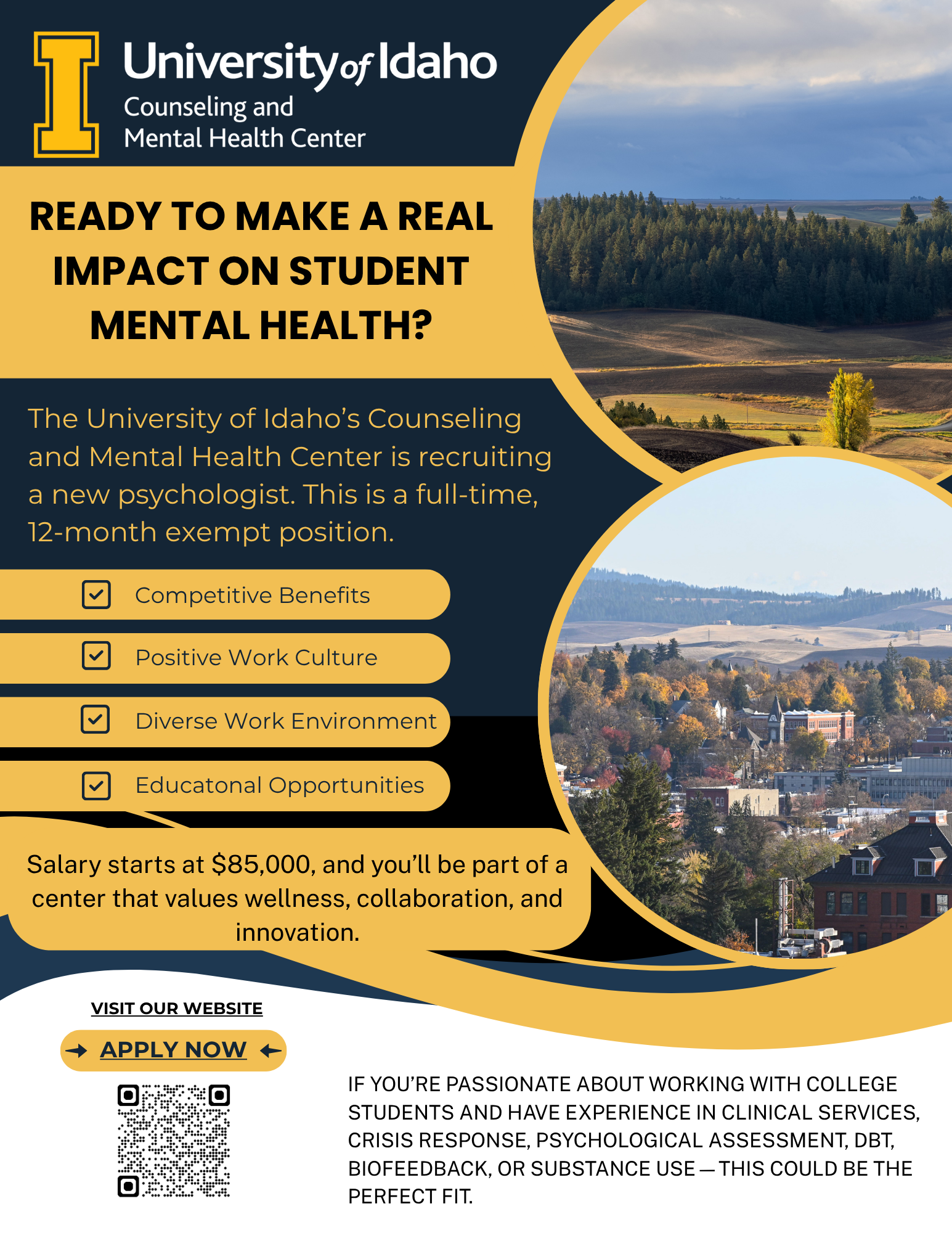 The University of Idaho Counseling and Mental Health Center (CMHC) is hiring a psychologist to enhance services and support student well-being. This full-time, 12-month exempt position offers a minimum salary of $85,000 or higher depending on experience. The CMHC provides counseling, crisis intervention, psychiatric care, and assessments through a brief therapy model focused on wellness. Additional services include substance use programs, outreach, consultation, and biofeedback programming. The CMHC is home to an APA-accredited doctoral internship in professional psychology. The center provides a supportive, stigma-free environment. Candidates should be committed to student well-being and advancing the center’s mission and values.